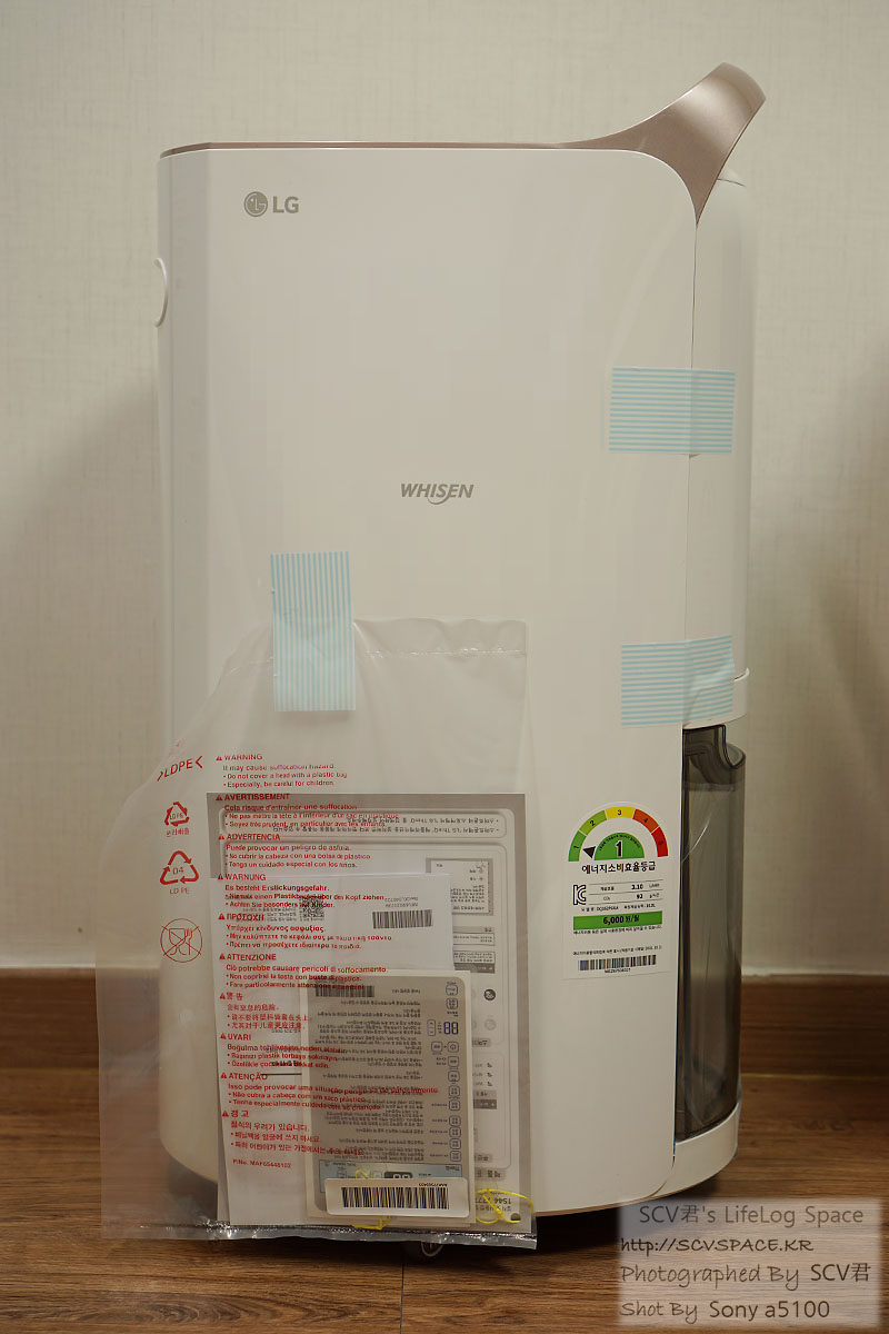 그리고 측면의 물통. 에너지 소비효율등급 스티커 뒤쪽 물통 방향으로는 LED램프도 달려있습니다. 수위확인용인 듯.