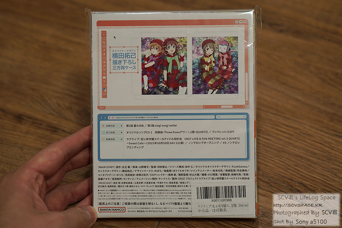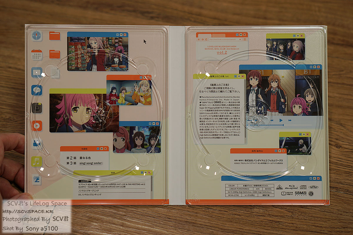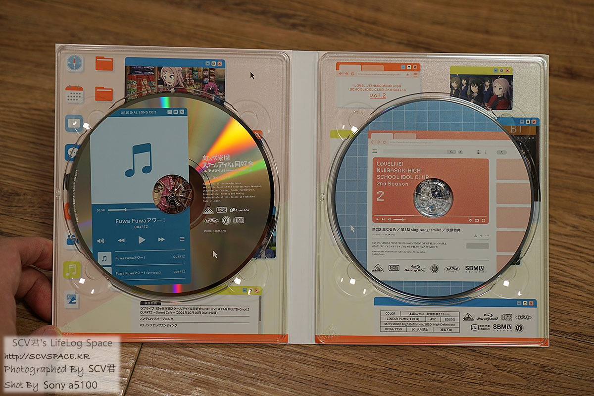 디스크의 경우, 반사면이 많이 보이는 왼쪽이 유닛곡 CD, 다른쪽이 본편 등이 담긴 블루레이입니다.