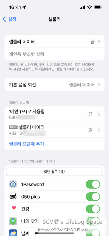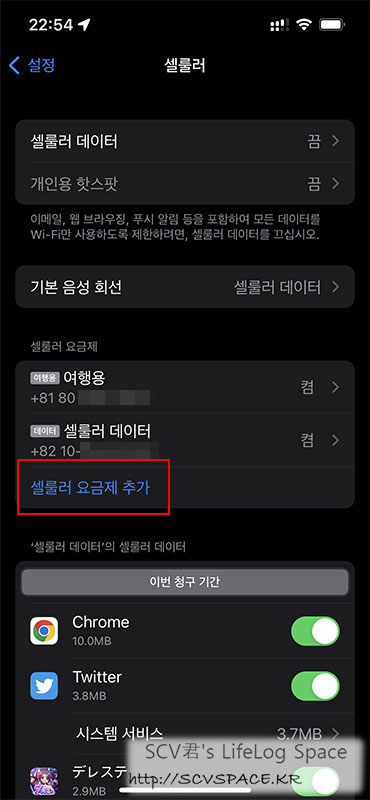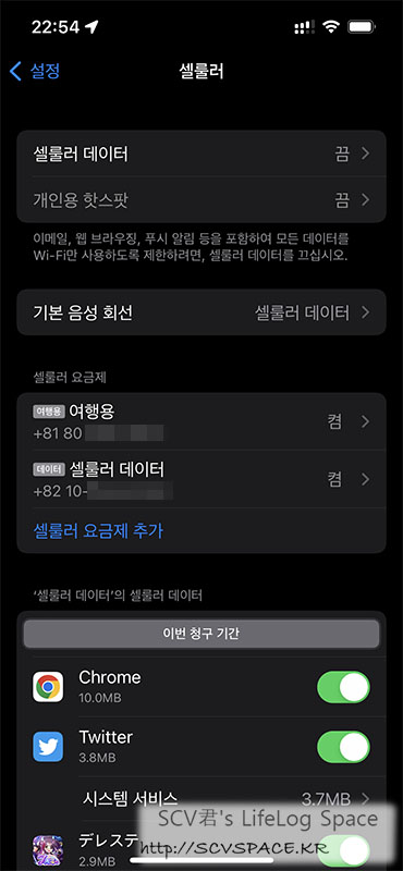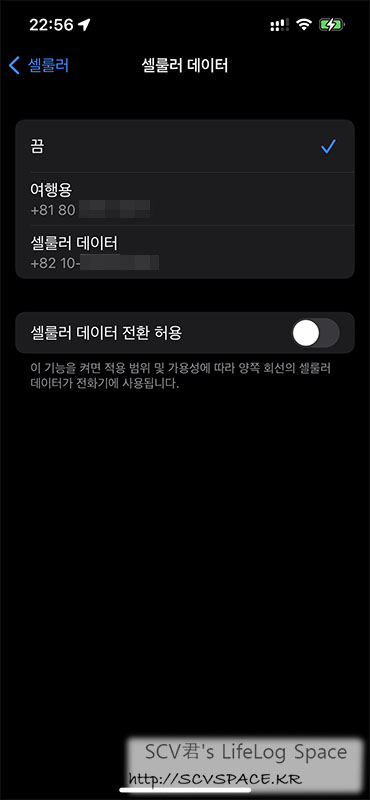 일본 SIM이라 혹여나 셀룰러 로밍 통신이 되면 곤란하기도 해서 '셀룰러 통신을' 끄고 싶은거였는데,