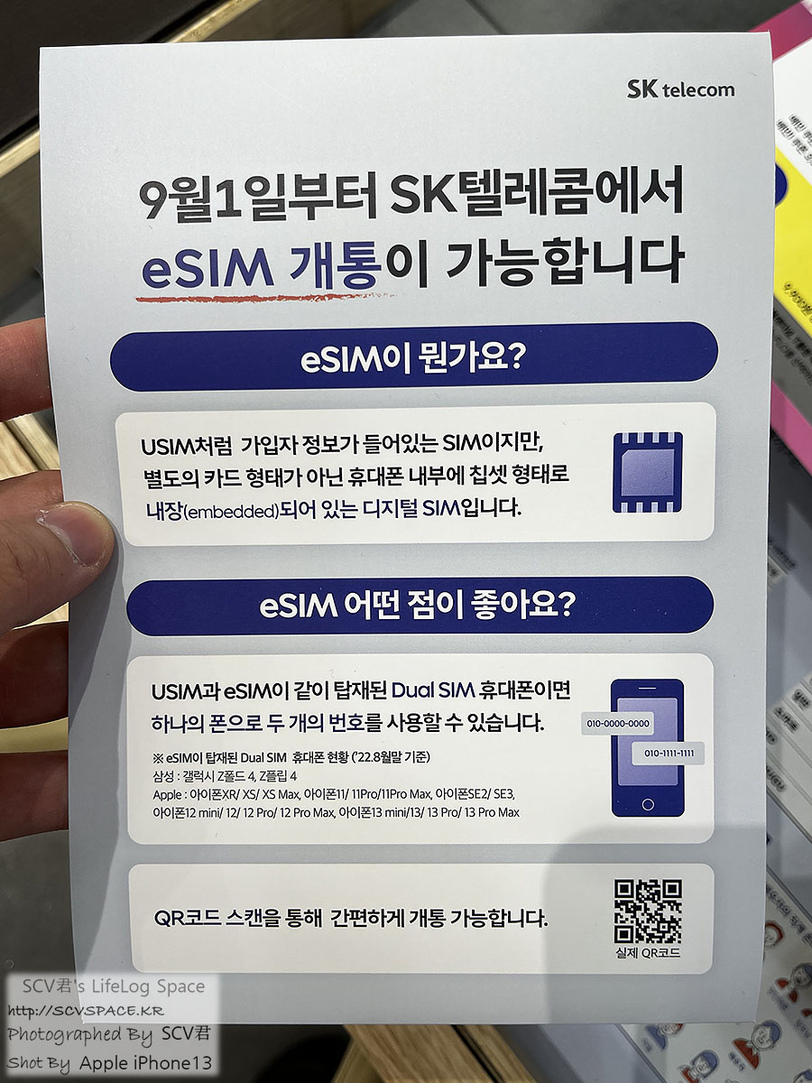 SK텔레콤용 eSIM 셋팅 QR코드 이게 SK텔레콤이 만든 eSIM 셀프개통 안내페이지[바로가기] 를 뒤져봐도 안나와서, 초기 설정할때 45초 정도 헤맸습니다.