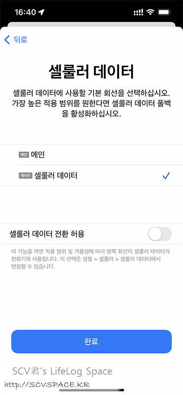 제어센터 아이콘을 통해 셀룰러를 켜도 직전에 켜졌던 회선이 자동으로 활성화되게 되어있구요.