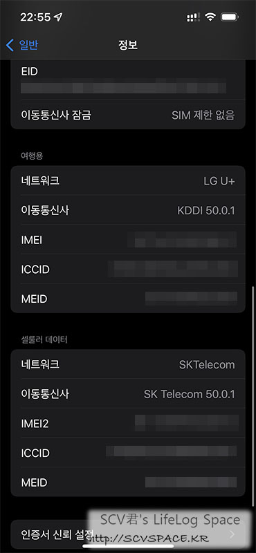 그 이야기는 3번에서 하기로 하고, 아무튼 설정이 잘 되었다면 이런식으로 두 SIM 정보가 설정에 모두 뜨게 됩니다.