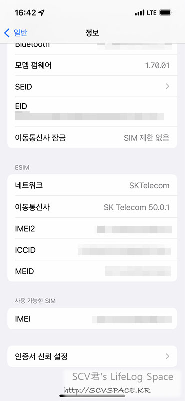 위 이미지 중에서는 세번째의 'iPhone' 으로 메모한 회선이 이번에 언급할 eSIM 정보로 등록되었습니다.