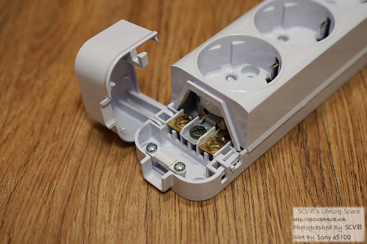 대체로 초록색은 접지 구입한 멀티탭은 측면 양쪽에 이렇게 접촉부가 있습니다. 열고닫는 데에 나사 안써도 되서 좋더군요.