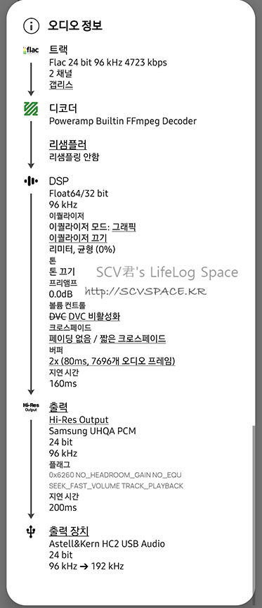사용한 기기는 갤럭시 노트20 울트라, 재생 프로그램은 PowerAMP 최신버전이고 Hi-res output 출력에서 96kHz(192kHz로 최종 업샘플링), 24bit로 입력되도록 설정 후 감상했습니다.