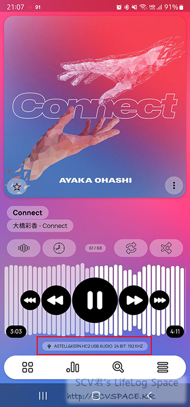 오른쪽에 재생중인건 Connect 라는 AK HC2 예약구입자 대상으로만 배포되는 신곡입니다. 192kHz 24bit WAV 포멧이었는데 기기에는 동 스펙의 FLAC로 저장해서 감상했구요. 사실 이것만 들은건 아니지만.