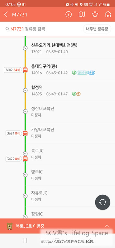 저는 전날과 동일하게 반대편 정류장에서 대화역행 마을버스를 탄 뒤, 대화역에서 합정 방향으로 가는 M7731에 탑승했습니다.