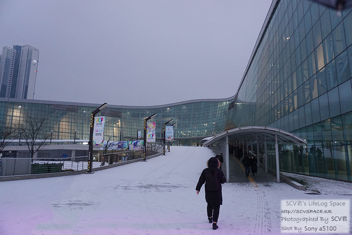 역시 전날과 비슷하게 새벽 6시쯤 집을 나섰고 같은 역에서 같은 버스를 탔지만 눈이 안온 덕분인지(토요일은 새벽에 눈이 왔습니다) 전날보다 10분정도 빠른 7시 20분에 킨텍스 제2전시장에 도착했습니다.