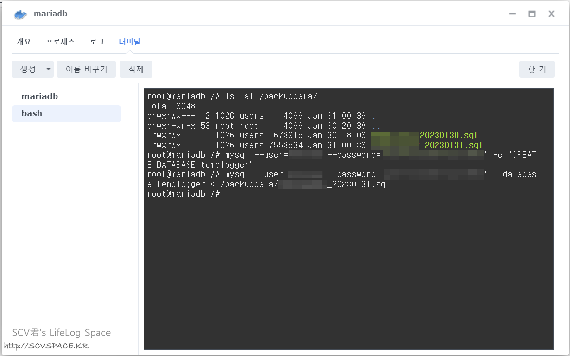 사용한 계정 같은게 흔친 않은데(admin 권한급의 계정을 썼으니), 비슷하게 시놀로지에서 Docker 구동할 계획이 있는 분께는 도움 됐으면 좋겠습니다.