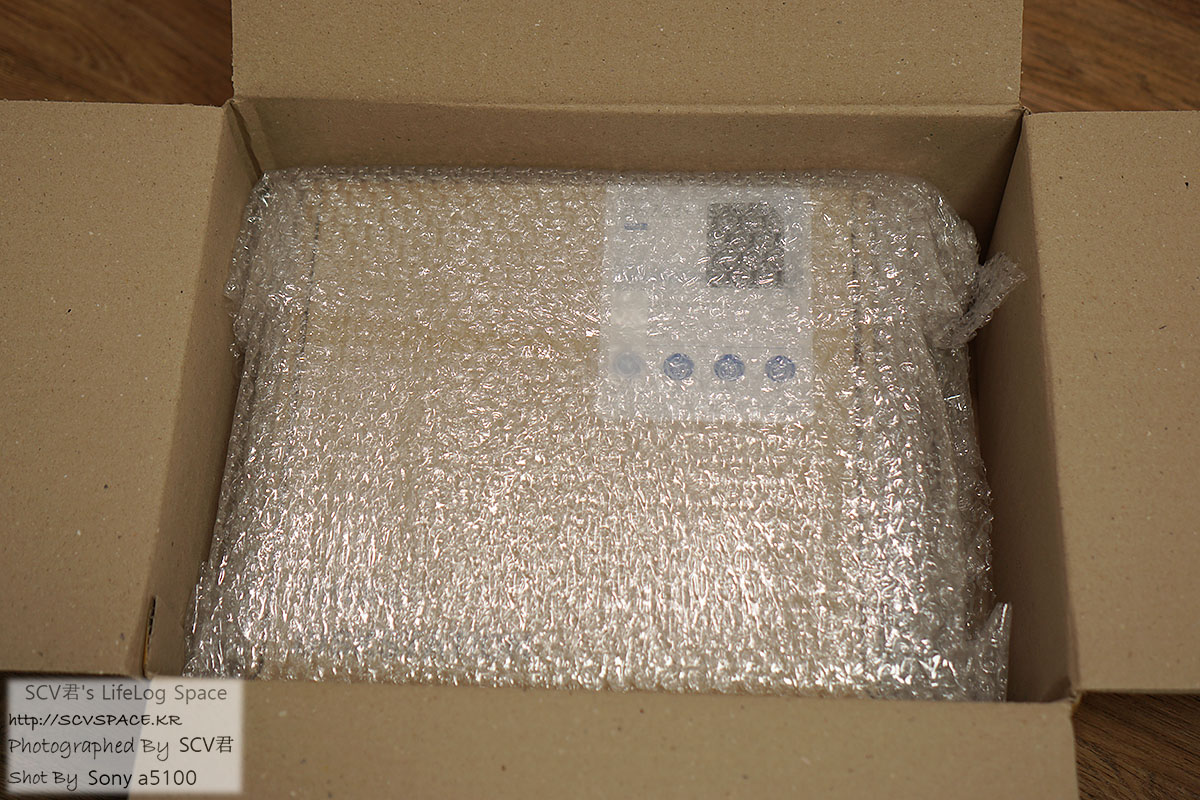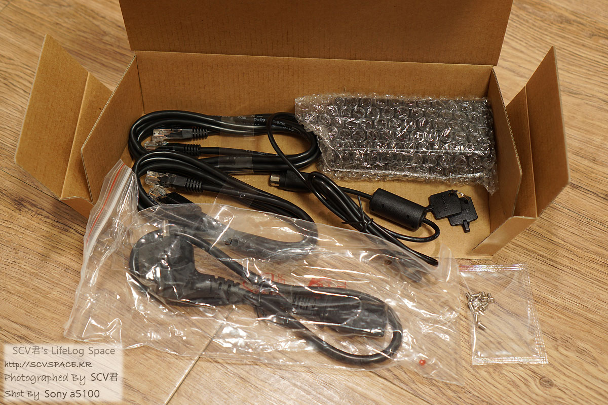 악세서리 박스에는 LAN케이블(5e) 이나 전원 어댑터, 추가 HDD 나사, HDD 트레이 열쇠(뽁뽁이로 싸인 어댑터 아래) 같은게 들어있구요.