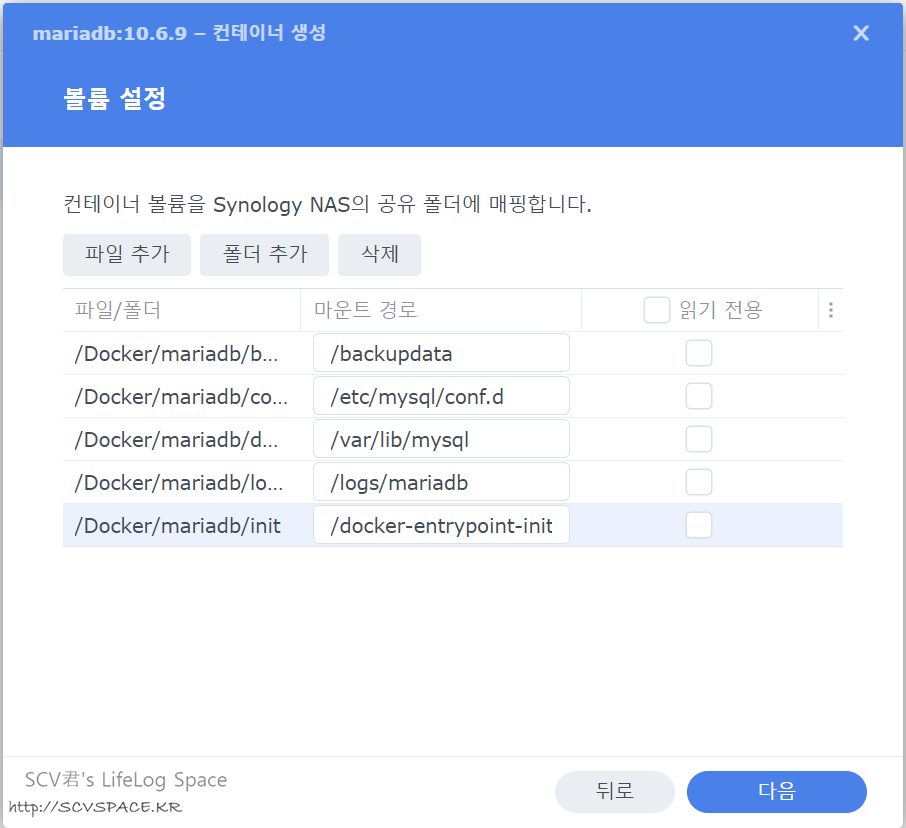 그렇지 않고 컨테이너를 실행했더니 마운트했던 Volume 들이 전부 읽기권한부터 없어서 설정이고 초기화 파일이고 죄다 permission denied.