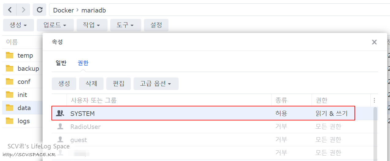 그래서인지 작업 최상위 폴더(위 경로에서는 mariadb 폴더) 에 SYSTEM 권한을 추가한 뒤 '읽기&쓰기' 를 주고 '하위경로 파일/폴더 포함' 을 선택해 적용하니 구동에 문제가 없었습니다.