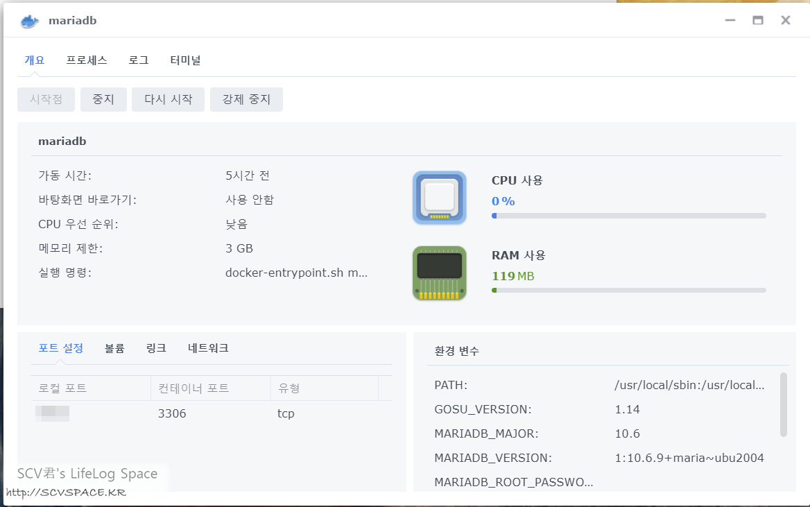 컨테이너의 환경변수 및 볼륨 마운트는 이렇게 설정됐습니다.