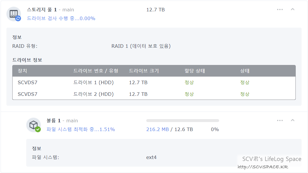 메인NAS는 항상 두 디스크에 완전히 동일한 데이터를 쓰는 RAID1(혹은 SHR 데이터 보호) 을 사용했습니다.