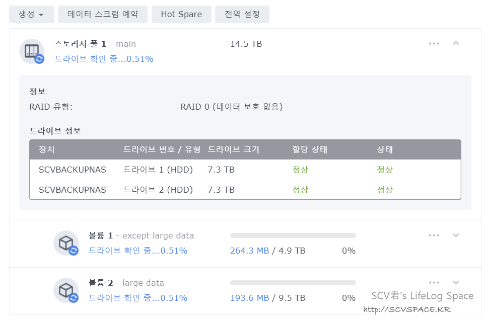 대신 디스크당 8TB 밖에 안되기 때문에 백업NAS의 경우는 처음으로 RAID0(디스크 용량 합 사용가능) 설정할 예정.