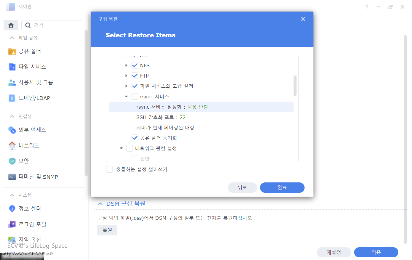 드라이브 검사가 끝나면 기존 NAS에서 설정을 백업받은 뒤 복원하고 초기 설정작업을 진행합니다.