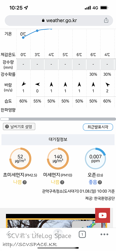 조금 이후의 시간(당시 시간 오전 10시 10분 무렵) 이긴 하지만 당시의 날씨 및 공기질 정보.