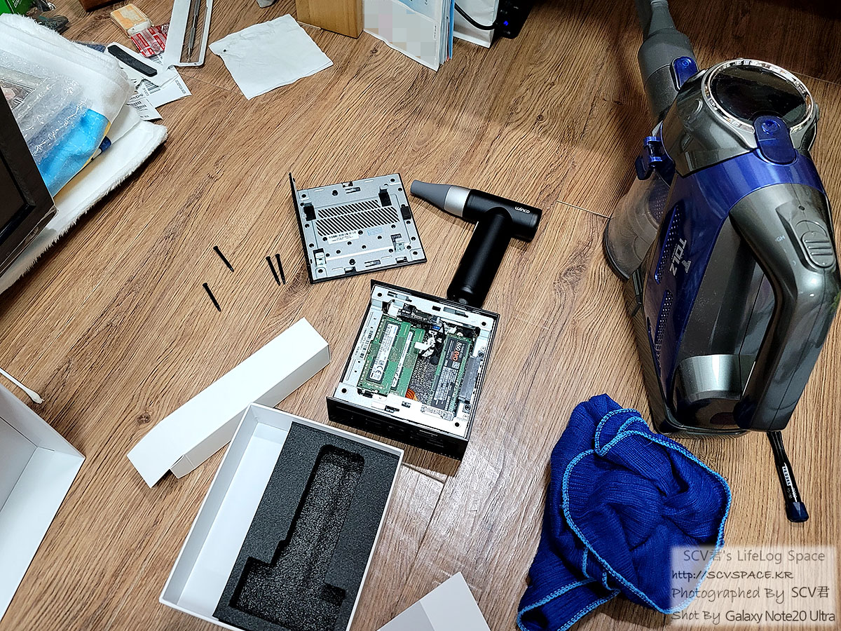 모니터를 바꾸기 위해 이것저것 위치조정을 하면서 미니PC 먼지 털어주던 모습이네요.