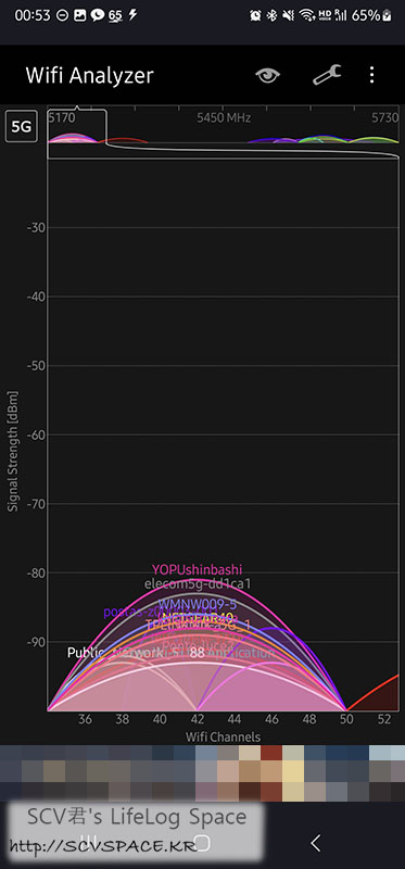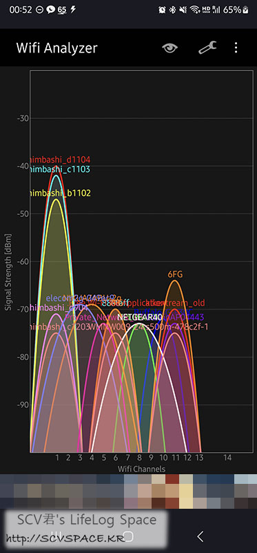 왼쪽이 2.4G, 오른쪽이 5G 대역 와이파이 SSID 그래프 다만 덕분에 2.4G 대역은 좀 혼잡합니다.