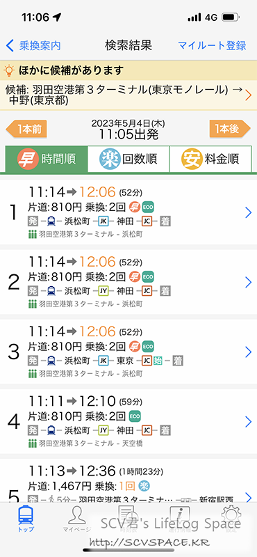 공연장이 있는 나카노까지는 최단시간 경로로 움직였습니다.