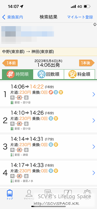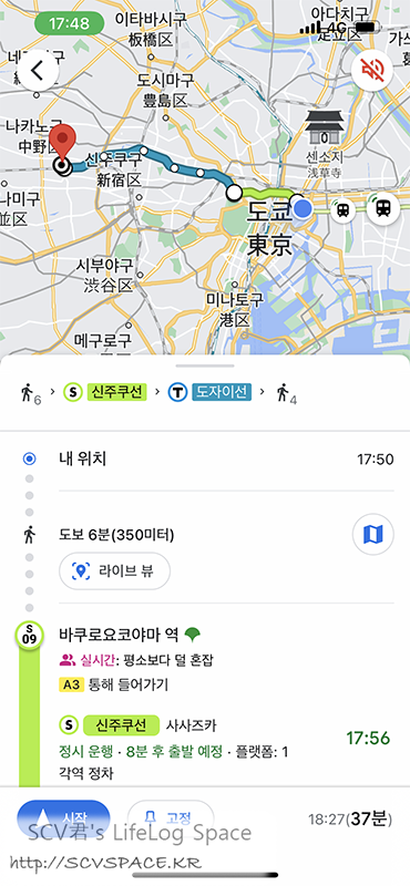 공연장이 있는 나카노까지는 최단시간 경로로 움직였습니다.