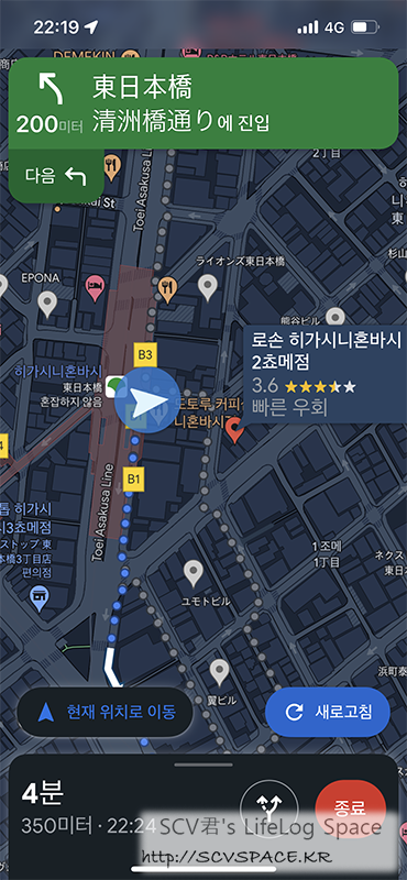 당시엔 단순히 칸다강 건너가니까 칸다 마츠리 생각했었는데, 지금 루트 찾아보니 사진 가운데 초록색 조명의 다리 쪽이네요. [홈페이지]