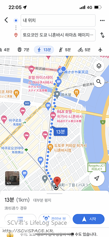 당시엔 단순히 칸다강 건너가니까 칸다 마츠리 생각했었는데, 지금 루트 찾아보니 사진 가운데 초록색 조명의 다리 쪽이네요. [홈페이지]