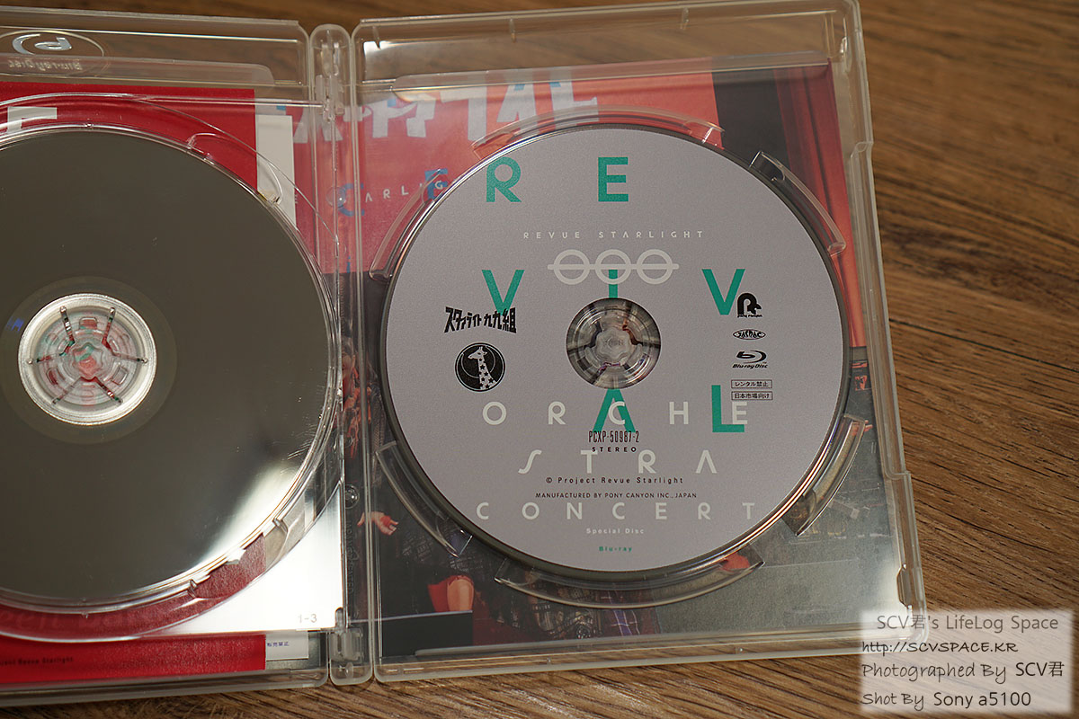 앞쪽 초록색 블루레이에는 오케스트라 콘서트 본편 실황이, 뒤쪽 회색 블루레이에는 영상특전인 '극장 공개 1주년 기념 극장판 현장 코멘터리 방송 실황' [상품페이지 보기] 이 담겨있습니다.