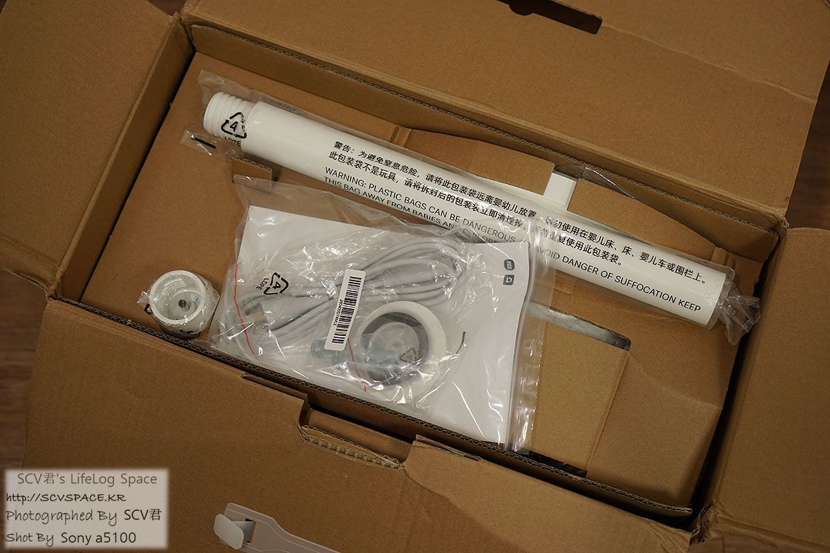 위쪽으로 박스를 열면 길이 조정이 가능한 긴 연결봉과 설명서, 전원케이블 등 악세서리가 보입니다.