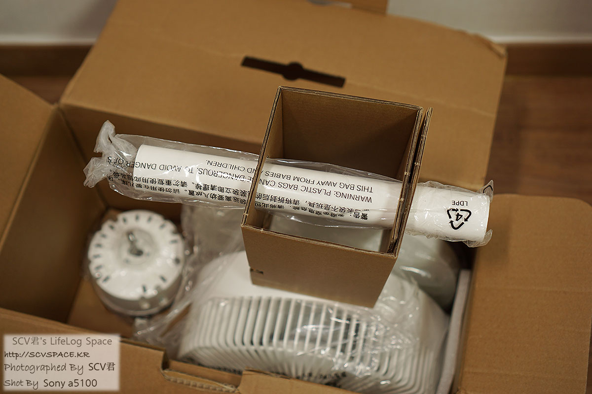 위쪽으로 박스를 열면 길이 조정이 가능한 긴 연결봉과 설명서, 전원케이블 등 악세서리가 보입니다.