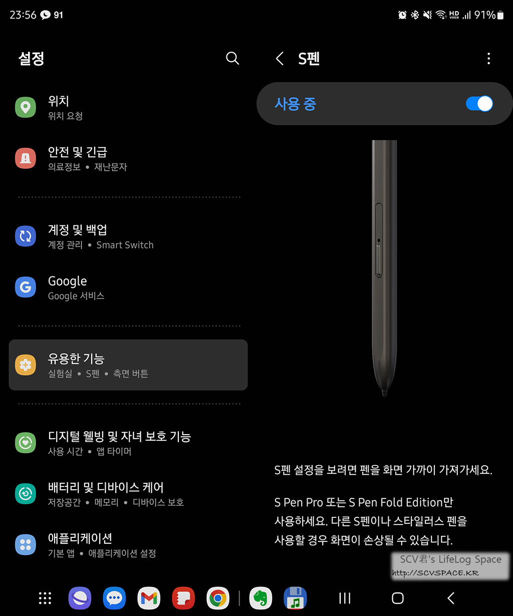 이렇게 케이스를 장착하고 S펜 메뉴로 들어가면 별다른 작업 없이도 이미 펜이 인식되어 있습니다.
