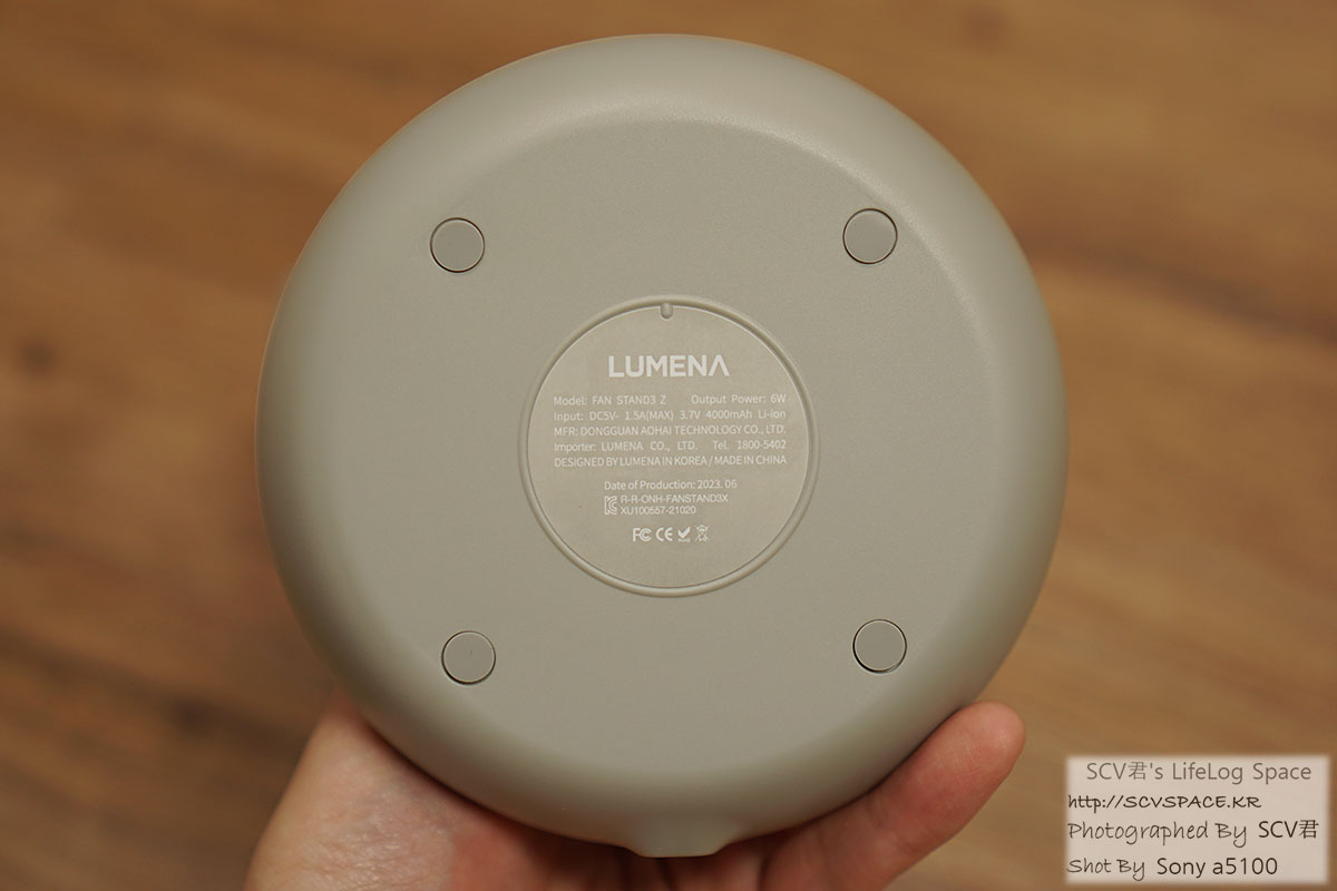 왼쪽이 동작중, 오른쪽이 충전중 바닥 부분에도 간단히 스펙이 명시되어 있고, 위쪽으로는 조작 다이얼이 하나 있습니다.