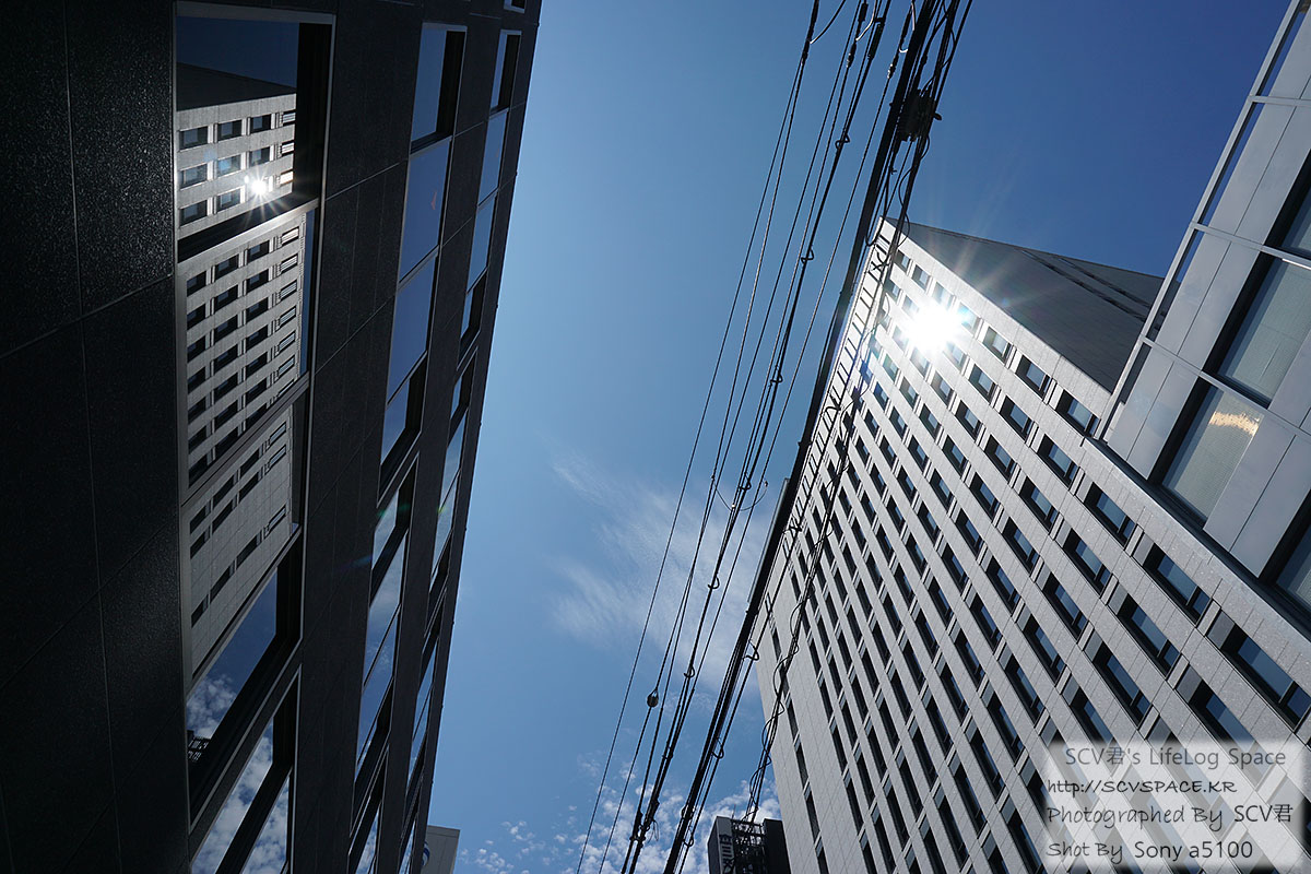 하늘은 저렇게 맑고 푸르며 위협적입니다만, 고층건물 덕분에 약간의 안전구역이 생기던 시간대.