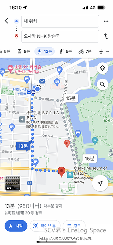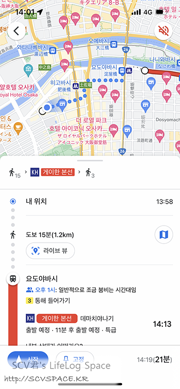 그러고보니 호텔이 있는 텐마바시까지는 이렇게 움직입니다.