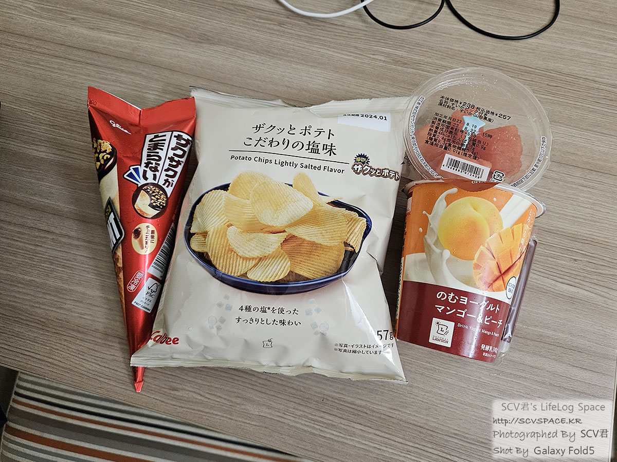 왼쪽이 로손에서 사온 것들입니다. 콘 아이스크림과 감자칩, 마시는 요구르트 망고, 소포장된 수박.