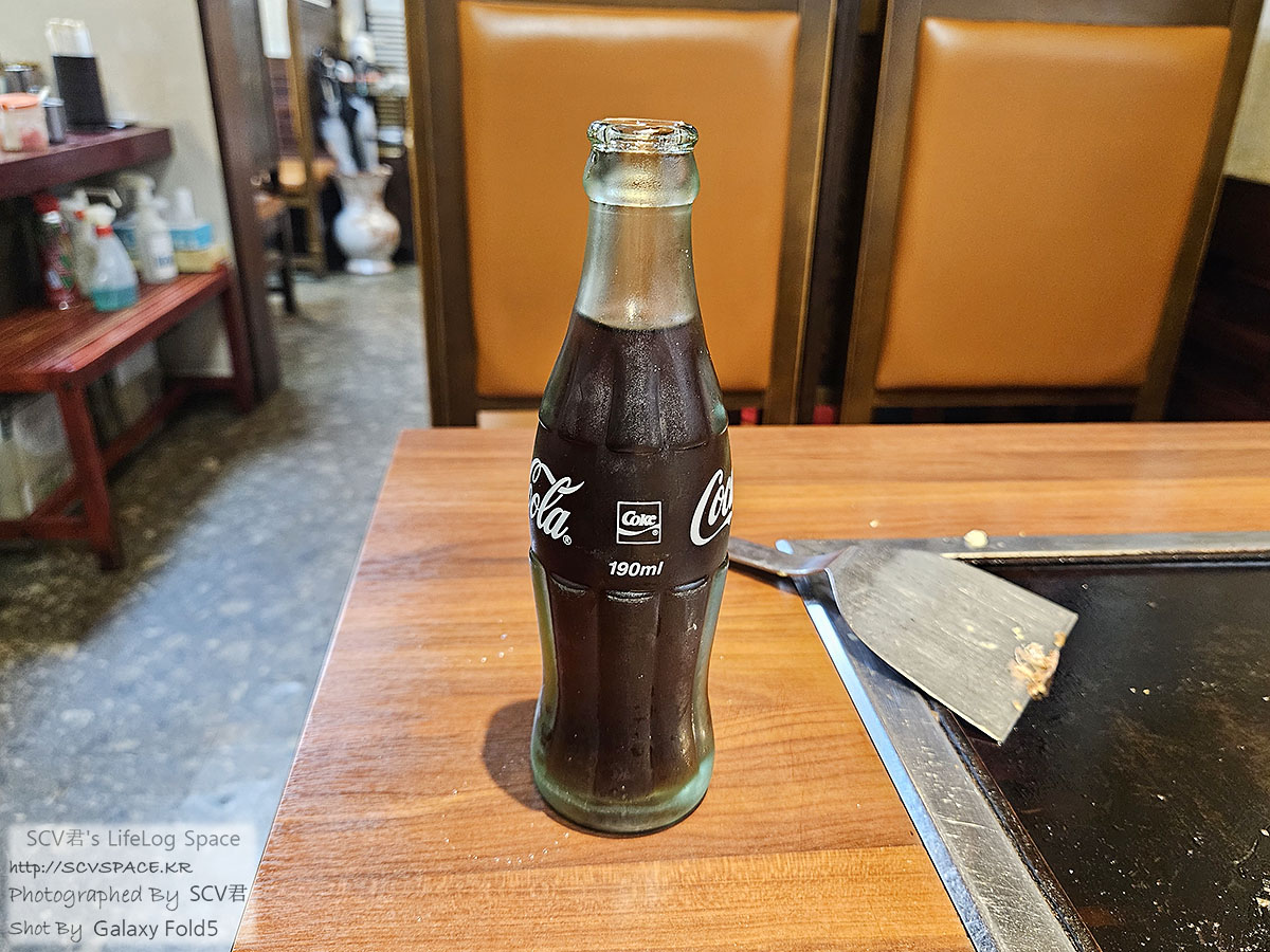 주문한건 오코노미야키(믹스) 1,000엔, 생맥주 작은컵(아마 300ml 대일듯) 450엔, 코카콜라(180ml 유리병) 250엔.