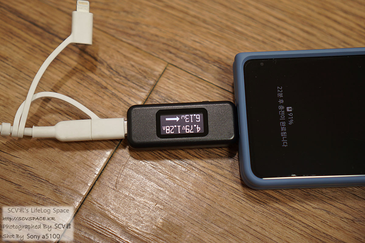 꽂아놓고 좀 지켜보면, 충전기와 기기가 정보를 주고받은 뒤 전압과 전류가 변동되는 모습을 볼 수 있습니다.