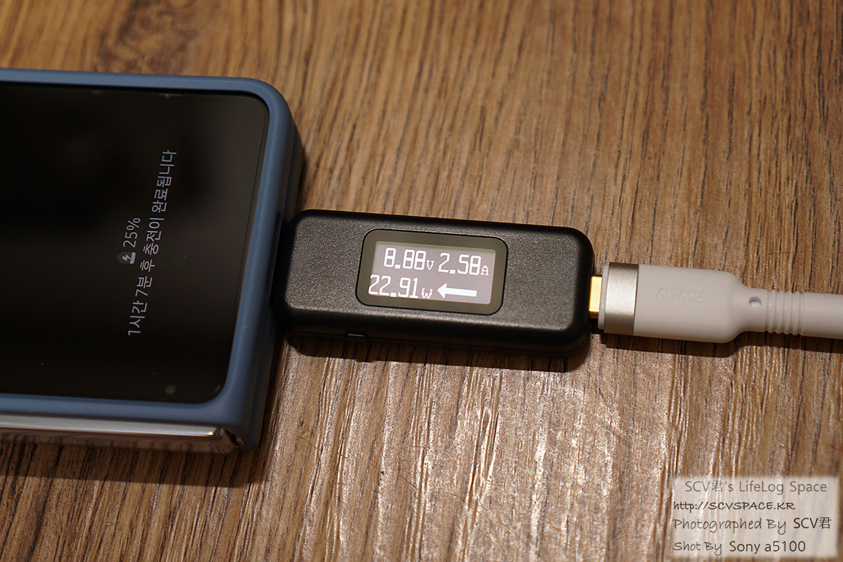 시험삼아 꽂아보니 이렇게 삼성 초고속충전(갤럭시 폴드5의 경우 최대 25W) 프로토콜을 깨지 않고 측정값이 나옵니다.