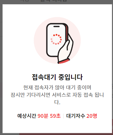 세번 시도했는데 매번 같은 예상시간과 대기자수가 뜨는거 보면, 대기자수는 20명의 몇배 이상이었을것 같습니다.
