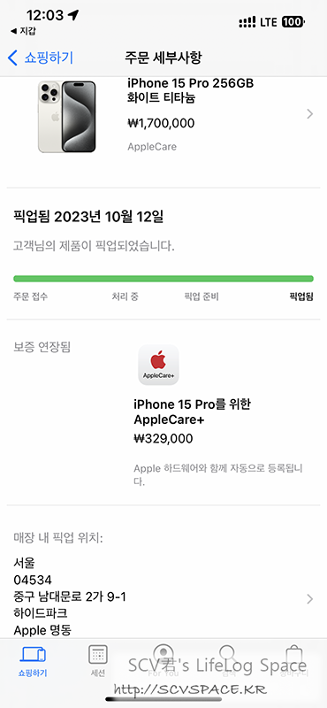 다음은 아이폰15 프로 수령. 방문픽업이어서 발매날 애플스토어 명동에 들러 수령해왔습니다.