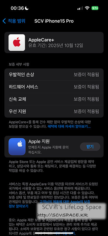 그 외에 애플케어 플러스도 자동으로 등록이 되어있습니다. 애플스토어 구입 계정이 이 한국 계정이었고.