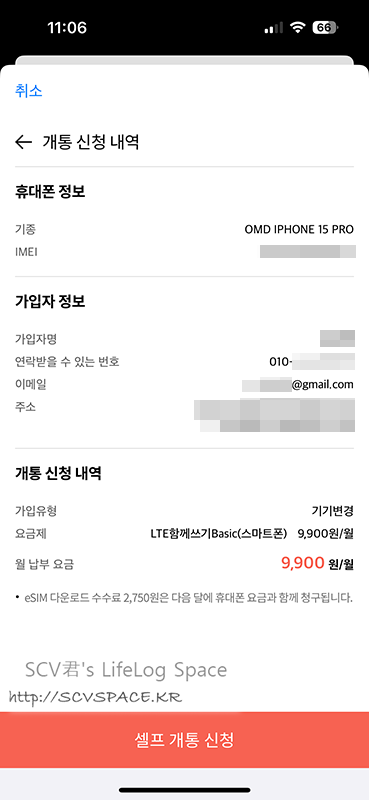 이렇게 해서 셀프개통신청 버튼을 누르면 eSIM 이동(기기변경 후 재다운로드) 이 완료될 것입니다.
