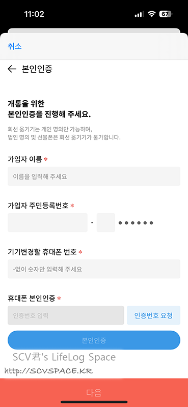 제 경우는 이게 모회선에 연결된 LTE 함께쓰기 자회선이고, 자회선도 전화번호가 할당되어 있어 그 번호 입력해 본인인증.