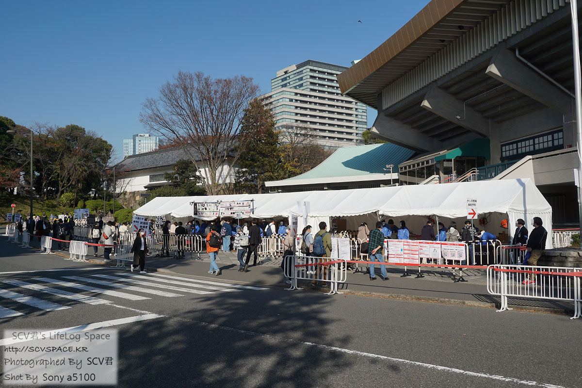 이 컷은 저기 빼꼼히 보이는 무도관 천장 빼고는 특별할게 없는데, 찍고 나서 오른쪽의 입구로 들어가려고 하니 티켓 있다고 소리치는 암표상이 있던 기억.