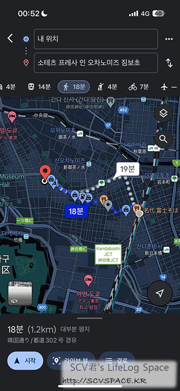 안보이는 남은 경로가 아마 오챠노미즈역(御茶ノ水駅) 까지 가서 호텔까지 걸어가는 경로였던걸로 기억.
