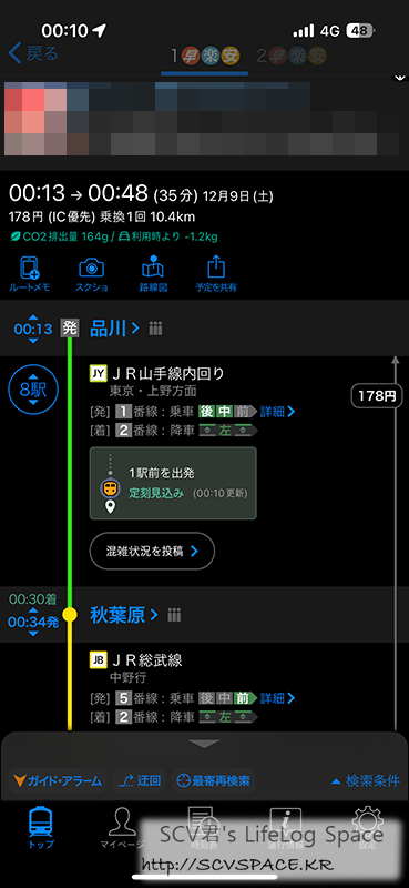안보이는 남은 경로가 아마 오챠노미즈역(御茶ノ水駅) 까지 가서 호텔까지 걸어가는 경로였던걸로 기억.