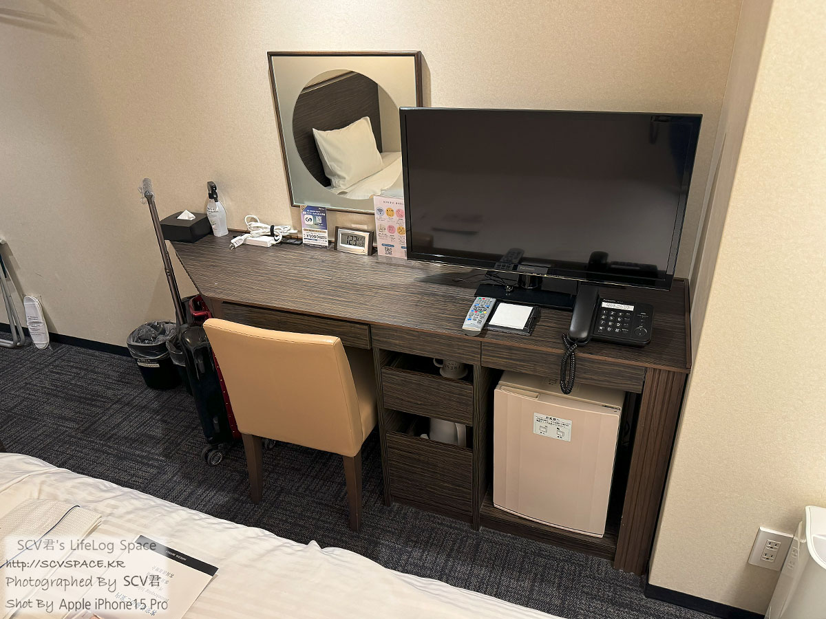 첫인상은 좀 좁게 보였는데, 일부러 내놓은 책상 앞 의자(+서랍)을 밀어넣고, 쓰레기통 옆(책상 맨 왼쪽) 아래 공간에 캐리어를 펼쳐보면 그럭저럭 나쁘지 않다는 인상.