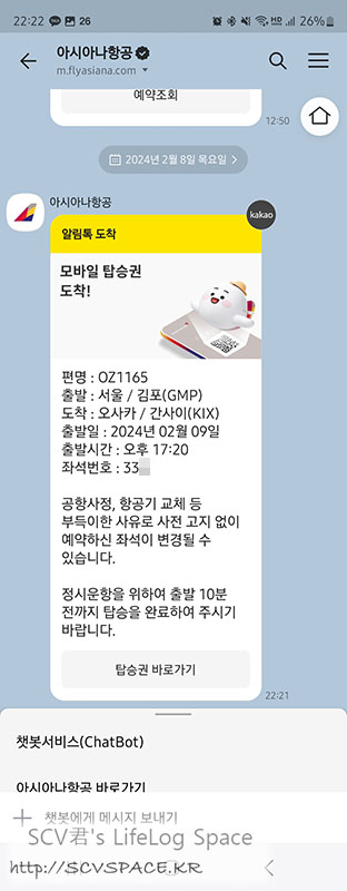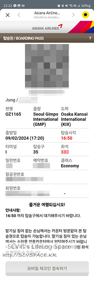 항공편 출발이 오후 5시 20분이라 한참 전에 왔어야 했는데 '그러고보니 없네..?' 하고 아시아나 모바일 웹에 들어가서 탑승권을 '재발송' 했습니다.