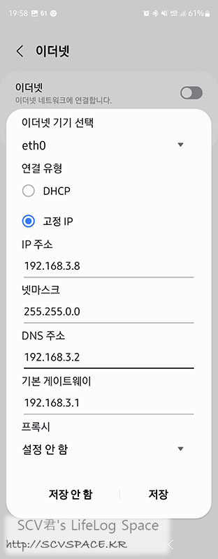 예, 이런식으로 실제 LAN이 작동하는 쪽과 완전히 다른 IP대역(최소한 세번째부터는 달라야 함) 을 고정IP로 임의 설정하는겁니다.