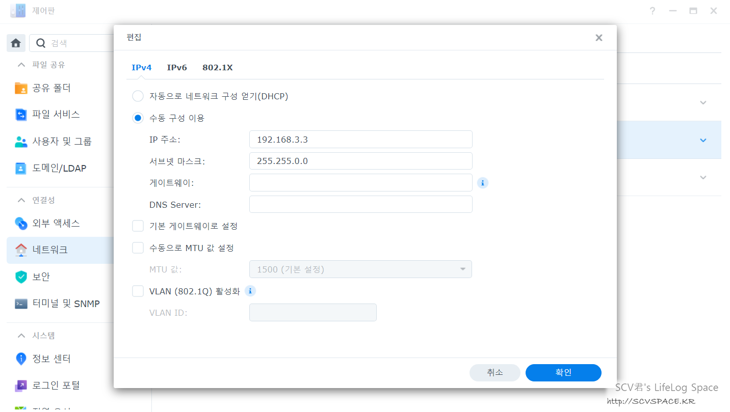 위 이미지는 메인NAS의 LAN2 설정이고, 백업NAS의 LAN 설정에서도 서브넷 마스크는 동일하게, IP는 맨 끝자리만 다르게 설정합니다.